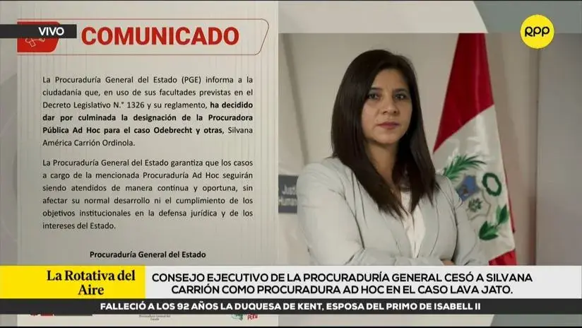 La Procuraduría General del Estado (PGE) ha culminado la desginación de Silvana Carrión Ordinola como Procuradora Ad Hoc para el caso Odebrecht y otros, «en uso de sus facultades previstas en el Decreto Legislativo N.° 1326 y su reglamento».En esa línea, la Procuraduría General del Estado señaló que se ha garantizado que los casos que se encontraban a cargo de Silvana Carrión «seguirán siendo atendidos de manera continua y oportuna, sin afectar su normal desarrollo ni el cumplimiento de los objetivos institucionales en la defensa jurídica y de los intereses del Estado». Silvana Carrión advirtió que remociones implicarían riesgos en avances en caso Lava JatoComo se recuerda, Silvana Carrión se pronunció el día de ayer en Prueba de Fuego de RPP,tras las declaraciones del ministro de Justicia, Juan José Santiváñez, quien advirtió que «todos los procuradores están en evaluación en este momento».Carrión advirtió que un cambio en el equipo que lleva el caso Lava Jato podría beneficiar a los acusados debido a la alta especialización requerida y generar un riesgo significativo para los avances logrados en este proceso judicial.»Cualquier remoción de los actores que vemos, el caso Lava Jato, Fiscalía, Procuraduría, que venimos conociendo mucho tiempo estos casos, creo que lo que hace es darle ventaja a la contraparte porque el nuevo que venga no va a tener todo ese conocimiento, digamos, en tan corto tiempo”, explicó Carrión en RPP.»[¿Cambiarlos implicaría un riesgo grande?] Sí, bueno, por la especialización. La experiencia internacional indica que la especialización y la expertise para este tipo de casos tan complejos es lo recomendable que la continúe en el tiempo para que pueda seguir conociendo estos casos y litigarlos de manera correcta», sostuvo tras respaldar su posición con los ocho años en el cargo.