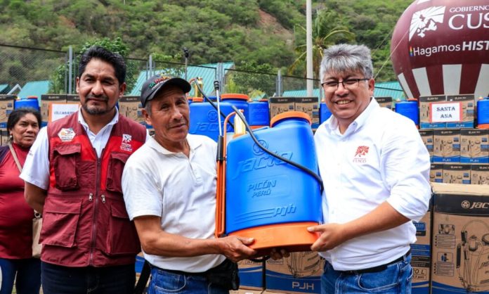 Un día antes en Quillabamba, el gobernador regional acompañado por todo su equipo técnico de gerentes, autoridades locales, consejeros regionales y población beneficiaria, hizo entregas en el marco de 3 proyectos estratégicos para el desarrollo rural. Con el ‘Proyecto Café’ de la Gerencia Regional de Agricultura, adjudicó 2 100 mochilas pulverizadoras a más de 2 400 cafetaleros organizados en 260 comités para la cobertura de más de 4 000 hectáreas de cultivo, así como 1 200 kilos de abono distribuidos en los distritos de Inkawasi y Quellouno.