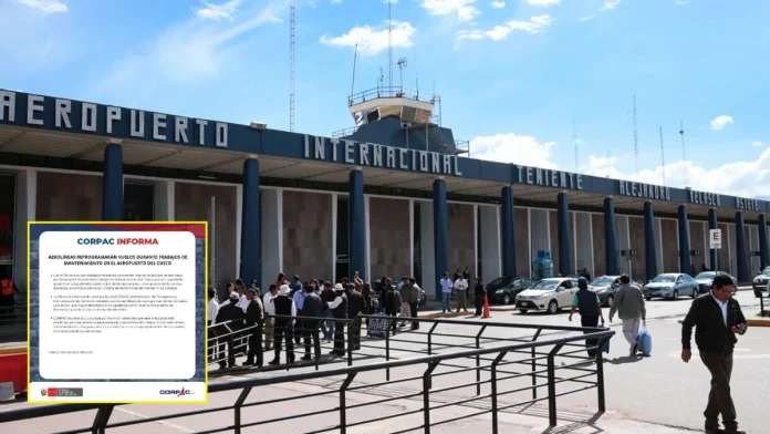 A tomar precauciones. La Corporación Peruana de Aeropuertos y Aviación Comercial (Corpac) anunció que las operaciones en el Aeropuerto Internacional Alejandro Velasco Astete del Cusco estarán suspendidas desde las 20:00 horas del lunes, 13 de octubre, hasta las 8:00 horas del martes 14. La entidad informó que esta medida se ejecutará debido a que se llevarán a cabo trabajos de mantenimiento en la pista de aterrizaje, a fin de garantizar la seguridad y continuidad de las operaciones en el terminal aéreo de la ciudad imperial.En un comunicado, Corpac precisó a través del documento que la Dirección General de Aeronáutica Civil (DGAC) del Ministerio de Transportes y Comunicaciones (MTC) viene coordinando con las aerolíneas la reprogramación de los vuelos, con el objetivo de evitar que los pasajeros se vean afectados en sus itinerarios durante las horas que el aeropuerto permanezca cerrado.“Corpac expresa sus disculpas por los inconvenientes que esta medida pueda ocasionar, pero es necesaria para asegurar operaciones sin riesgos ni inconvenientes. Recomendamos a los pasajeros y usuarios consultar la reprogramación de sus vuelos con cada una de sus aerolíneas”, concluyó.