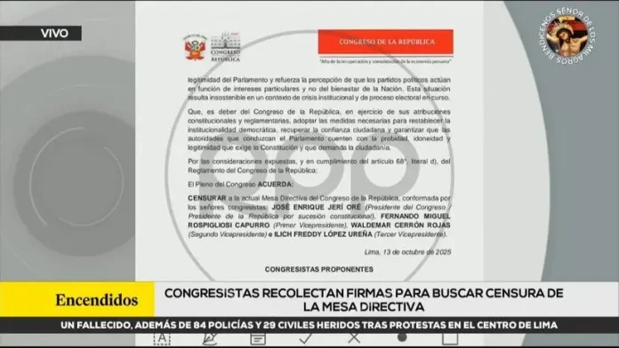 Un grupo de congresistas se encuentra en la búsqueda de firmas para presentar una moción de censura contra la Mesa Directiva del Parlamento.Según el documento al que tuvo acceso RPP, se establece que «la permanencia de la actual Mesa Directiva en sus cargos constituye un grave riesgo para la estabilidad democrática del país», así como «el incumplimiento del compromiso público de Fuerza Popular, evidenciado en la asunción del señor Fernando Rospigliosi en la presidencia del Congreso.Ello, pese a la promesa de su bancada de no presidir el Parlamento, sumado a graves investigaciones fiscales que afrontan Waldemar Cerrón e Ilich López, los otros vicepresidentes, y a la responsabilidad política de haber permitido que José Jerí asumiera la Presidencia de la República.Bajo estos argumentos, se «descalifica la actual mesa directiva para conducir el Congreso de la República».El documento es firmado por los congresistas Alfredo Pariona, Pasión Dávila, Jaime Quito -quien anunció ayer en RPP justamente esta moción de censura- Silvana Robles, Ruth Luque, entre otros parlamentarios. Como se recuerda, si se censura a la Mesa Directiva del Congreso, José Jerí dejaría de ser o dejaría de asumir la Presidencia de la República. Por lo tanto, tendría que hacerse una nueva elección para elegir una nueva Mesa Directiva y quien gane la presidencia asumiría las funciones de presidente de la República, esto en el caso que se censure a la actual Mesa Directiva.
