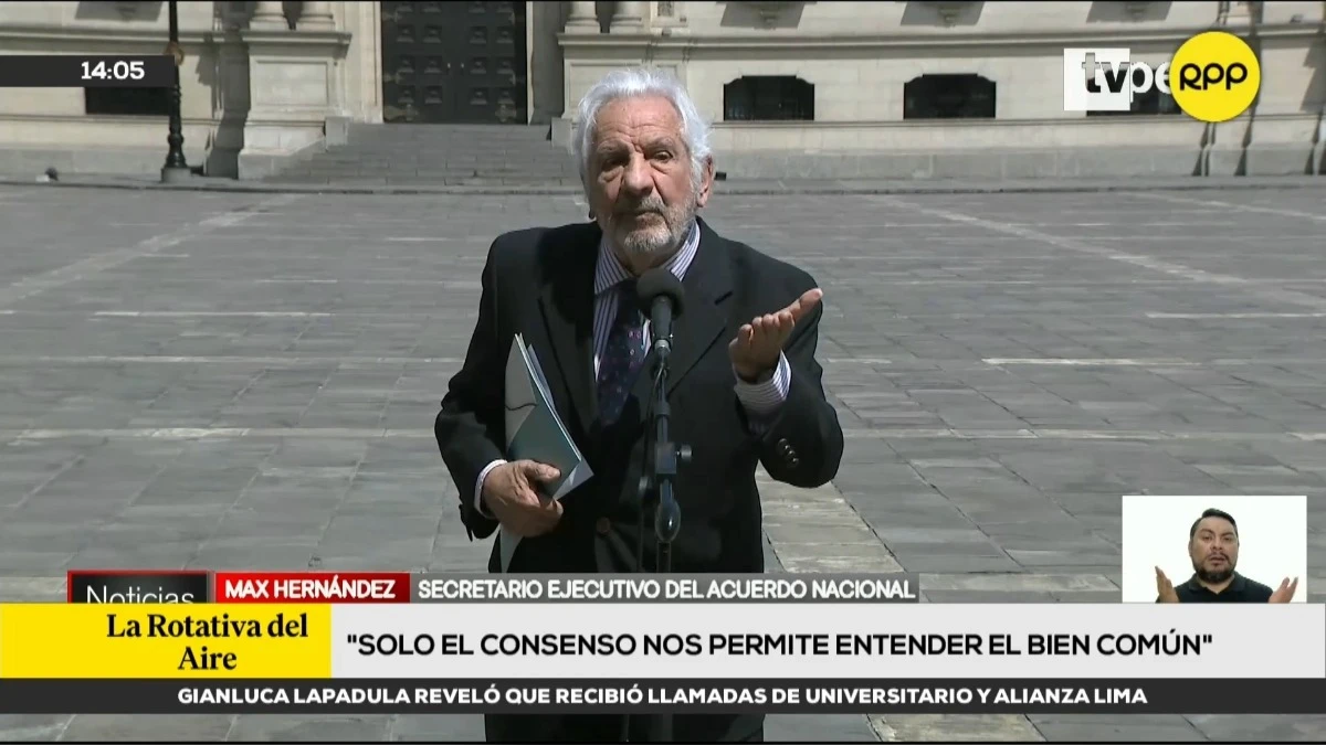 Max Hernández, secretario ejecutivo del Acuerdo Nacional, brindó detalles a los medios de comunicación tras la sesión número 134 del foro en donde pidió un diálogo entre las instituciones del Estado (Ejecutivo, Legislativo, Poder Judicial, Defensoría, etc.).Además, señaló que las elecciones generales 2026 están garantizadas, luego de la reunión que estuvieron presentes el mandatario interino, José Jerí, y los titulares de JNE, ONPE y Reniec en Palacio de Gobierno.También RPP pudo constatar que estuvieron presentes la congresista de Fuerza Popular, Patricia Juárez, el presidente de Acción Popular, Julio Chávez, el defensor del Pueblo, Josué Gutiérrez, el gobernador regional del Callao, Ciro Castillo, entre otros.Al ser consultado sobre si el documento firmado sobre seguridad se contempla el toque de queda, señaló que el «documento que se aprobó fue el preparado», luego José Jerí anunciara en sus redes sociales la inminente declaratoria de un estado de emergencia en el país ante la crítica situación de inseguridad ciudadana.Por otro lado, destacó que en el Acuerdo Nacional se buscan consenso «en los cuales haya acuerdo pleno» porque ello «permite entender el bien común».»Yo soy secretario de un foro dialogante. En el Acuerdo Nacional no hay votación. No buscamos una mayoría ni tratamos de arrinconar a una minoría. Lo que buscamos son consensos en los cuales haya acuerdo pleno. En el Acuerdo Nacional, todas las instituciones del Gobierno de sus tres niveles, de la sociedad civil, en la amplitud que tiene -y que pensamos ampliarlo además- y los partidos políticos presentes en el Congreso -porque esa es la norma del Acuerdo Nacional-, esa suerte de triángulo equilátero ha logrado inculcar la idea de que sólo el consenso nos permite entender el bien común», puntualizó.»Evidentemente, hay momentos en que lo que se necesita es una acción inmediata. En ese sentido, el acuerdo trata de ver de qué manera esa acción inmediata que se va a efectuar por quienes están en capacidad constitucional de hacer esa efectuación, puedan entender que es necesario igual buscar el consenso, porque de otra manera vamos a tener que personas que han alcanzado una posición de poder piensen que con conseguir los votos, es decir, la mitad más uno, ya se puede acorralar a quien ganó no 51%, sino sólo 49%», añadió. Debate para finalizar los discursos de odioDentro de lo conversado en la reunión, Max Hernández informó que se toco el tema de las divisiones y los dicursos de odio, en donde sostuvo que se debe emplear «una profunda autocrítica, una profunda situación de compromiso».»Pero, ¿qué pasa si la gente dice, quiero terminar con esos discursos de odio? ¿Qué quiere decir? Que solo esos son los discursos de odio y no los discursos de odio que yo podría plantear», añadió.Agregó que se debe abrir la posibilidad de ser convencido sin buscar solamente convencer al otro respecto a sus posturas políticas.»Lo único que no puedo decir es que son fantasías de juventud porque a mi edad dirían es de repente la fantasía de un viejo. Probablemente lo sea. Pero si consideramos que lo que necesitamos es menos violencia verbal o física y más entender que los problemas del Perú son muy grandes, pero no más grandes que nuestra historia, no más grandes que nuestra sociedad, no más grandes que un pasado de enorme importancia que hemos tenido. Un pasado de miles de miles de años», puntualizó.En ese sentido, dijo que se debe «construir confianza» entre la sociedad y el Estado y entre los propios ciudadanos.»Cuando he estado en el Acuerdo Nacional y han venido una serie de grandes expertos en diálogo y resolución de conflictos, los más importantes del mundo, nos decían, ‘no entendemos’. Porque acá no es un problema solamente de enfrentamientos, son enfrentamientos de odio y de descalificación del otro, sino que hay otro problema», mencionó.