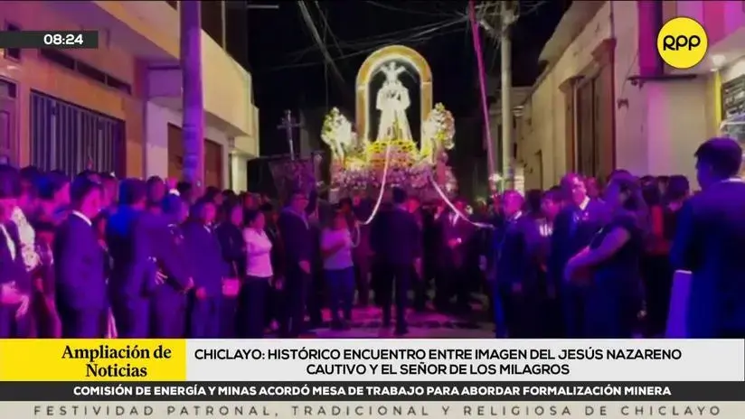 Este sábado, 25 de octubre, será una fecha histórica para el calendario religioso lambayecano, porque por primera vez se encontrarán las imágenes del Jesús Nazareno Cautivo, patrono de Monsefú, y el Señor de los Milagros de Campodónico. La jornada religiosa comenzó esta mañana, a las 8:00 a.m., con una misa en la iglesia San Pedro de Monsefú. Posteriormente, está prevista la salida del Nazareno Cautivo, con destino a Chiclayo, informó el corresponsal de RPP en la región. La sagrada imagen será recibida con un homenaje por el colegio Santa Ángela. El encuentro entre Jesús Nazareno cautivo y el Señor de los Milagros de Campodónico está programado para las 6:30 p.m. de este sábado, en la cuadra 15 de la calle Leoncio Prado de Chiclayo.Hay mucha expectativa y fervor religioso por el que será el primer encuentro oficial entre las mencionadas imágenes religiosas, resaltó nuestro periodista en Lambayeque.
