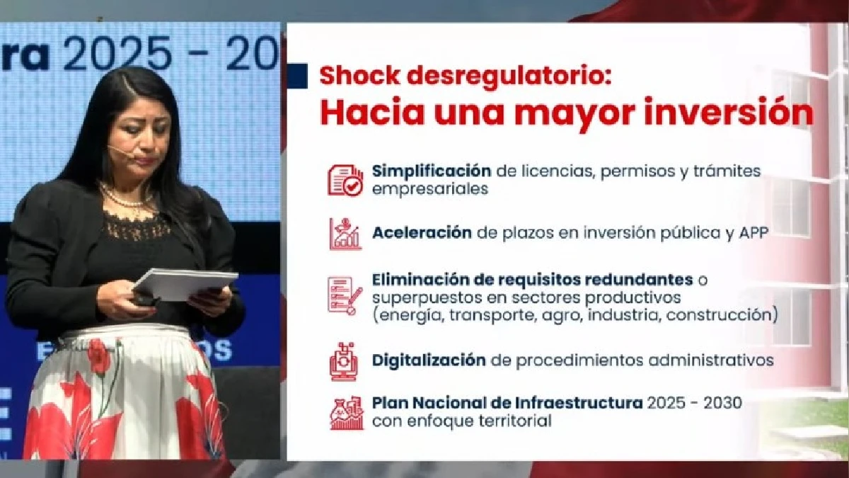 Durante su participación en la Conferencia Anual de Ejecutivos 2025, la ministra de Economía y Finanzas, Denisse Miralles anunció la próxima implementación de un programa para la eficiencia del gasto público.“Estamos implementando un programa de eficiencia de gasto que permitirá canalizar hasta S/ 1200 millones para asignarlos de seguridad ciudadana y otros sectores prioritarios de servicios esenciales”, anunció en el foro Crecimiento Económico.  La titular del MEF precisó que este presupuesto se ejecutará durante lo que resta de 2025 y adelantó que el decreto de urgencia correspondiente sería aprobado esta semana en la sesión del Consejo de Ministros.Además, Miralles resaltó que la posición del gobierno de transición de José Jerí tiene dos certezas: Generar tranquilidad para las familias y reglas claras para invertir.Shock desregulatorioAsimismo, la ministra indicó que el Ejecutivo está retomando las medidas desregulatorias para promover la inversión privada.“Con el compromiso de todos los ministros de sectores prioritarios involucrados con estas medidas estamos reimpulsando el shock desregulatorio nacional”, destacó.- Shock Regulatorio Nacional: Se está reimpulsando el shock regulatorio nacional, iniciado a principios de año, para simplificar licencias, permisos y trámites, además de acelerar los plazos de las inversiones en infraestructura estratégica. Se busca la eliminación de requisitos redundantes y la digitalización de procedimientos.