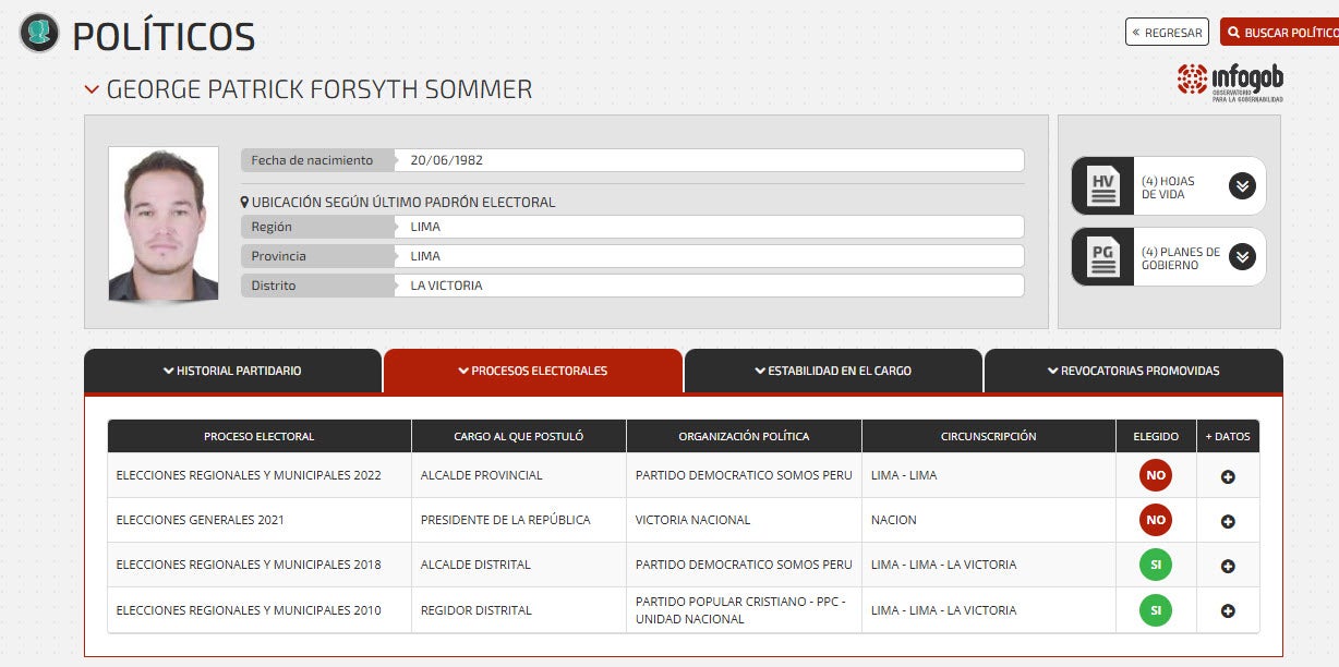 El partido Somos Perú oficializó a sus precandidatos que integran la fórmula presidencial rumbo a las elecciones generales que tendrán lugar en abril de 2026. Uvaldo Pizarro, vocero de dicha agrupación política, confirmó a RPP que el exalcalde de la Victoria, George Forsyth, encabeza la fórmula. Lo acompañan Johanna Gabriela Lozada Baldwin, en la primera vicepresidencia; y Herbe Olave Ugarte, en la segunda. «El partido democrático Somos Perú, a través del órgano electoral central y la ONPE, ha presentado la fórmula presidencial de la siguiente manera: para presidente de la república George Forsyth; como primera vicepresidenta Johanna Gabriela Lozada Baldwin; como segundo vicepresidente a Herbe Olave Ugarte. De esta manera, esta plancha presidencial estará continuando con el cronograma electoral planteado por el JNE”, indicó Pizarro. La fórmula de Somos PerúEl exarquero de la Selección Peruana George Forsyth está afiliado a Somos Perú desde el 2021. El vocero del partido indicó, en Enfoque de los Sábados, que es el «candidato natural» de la agrupación política rumbo a la Presidencia. Forsyth Sommer fue elegido regidor distrital de La Victoria en las Elecciones Regionales y Municipales 2010 por el PPC-Unidad Nacional. Ocho años después, volvió a postular en la misma jurisdicción, esta vez con Somos Perú, y resultó electo alcalde, con más de 40 mil votos.Sin embargo, no completó su gestión. El 13 de octubre de 2020, a menos de dos años en el cargo, Forsyth oficializó su renuncia para participar en las Elecciones Generales 2021. Finalmente, George Forsyth ocupó el octavo lugar en las elecciones presidenciales de 2021, con poco más de 814 mil votos. Su partido, Victoria Nacional, obtuvo el 5,65 % del total de votos emitidos. Meses después, anunció una nueva incursión política, postulando a la Alcaldía de Lima bajo el partido Somos Perú. Tampoco resultó elegido, habiendo quedado en el tercer lugar, detrás de Daniel Urresti.