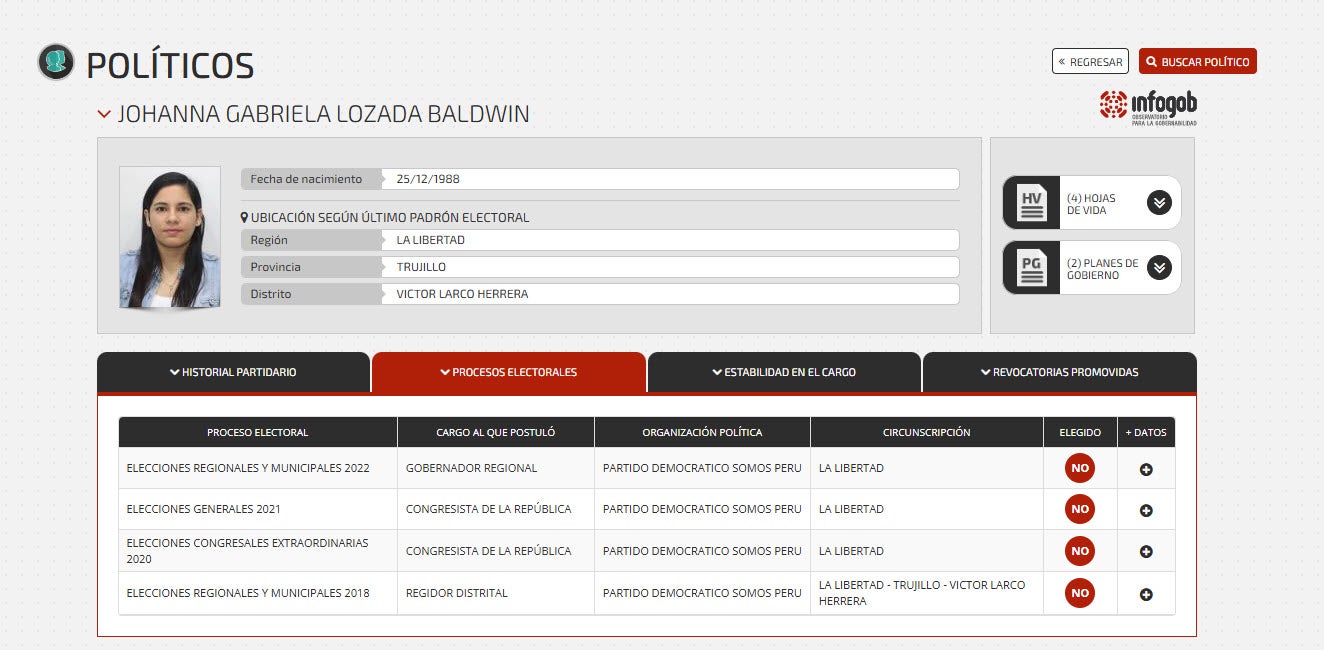En cuanto a Johanna Gabriela Lozada Baldwin, precandidata en la Primera Vicepresidencia, ella es parte del Comité Ejecutivo Nacional de Somos Perú, en el cargo de secretaria nacional de Descentralización, Gobiernos Regionales y Locales, para el periodo 2025-2029.Su afiliación al partido, según el portal Infogob, data del 2019. Por Somos Perú, ella fue candidata a regidora del distrito de Víctor Larco Herrera, Trujillo, región La Libertad, en 2018; también candidata a congresista en 2020 y 2021; y, finalmente, candidata a gobernadora regional de La Libertad en los comicios de 2022. En ninguno de esos procesos tuvo éxito.