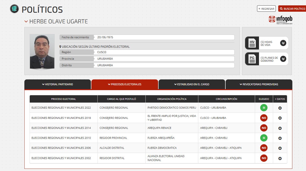 Finalmente, Herbe Olave Ugarte, precandidato a la Segunda Vicepresidencia, es afiliado a Somos Perú desde el 2021, según Infogob. Con el partido, postuló al cargo de Consejero Regional del Cusco en los comicios de 2022, y resultó elegido.