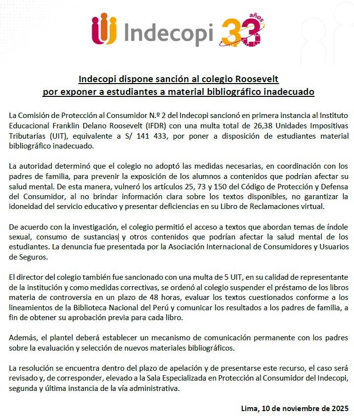 El Instituto Educacional Franklin Delano Roosevelt (IFDR), conocido como Colegio Roosevelt, fue multado con 26,38 Unidades Impositivas Tributarias (UIT), una cifra equivalente a S/ 141,433 porque la institución educativa puso a disposición de sus estudiantes material bibliográfico considerado inadecuado.La Comisión de Protección al Consumidor N.º 2 del Indecopi determinó que el colegio incurrió en una vulneración de los artículos 25, 73 y 150 del Código de Protección y Defensa del Consumidor, al identificar que la institución «no brindó información clara sobre los textos disponibles, no garantizó la idoneidad del servicio educativo y presentó deficiencias en su Libro de Reclamaciones virtual».La investigación se centró en la exposición de los alumnos a contenidos que podrían afectar su salud mental. De acuerdo con la autoridad, el colegio permitió el acceso a textos que abordan «temas de índole sexual, consumo de sustancias y otros contenidos que podrían afectar la salud mental de los estudiantes».La Comisión de Protección al Consumidor N.º 2 del Indecopi subrayó que el colegio «no adoptó las medidas necesarias, en coordinación con los padres de familia, para prevenir la exposición de los alumnos a contenidos que podrían afectar su salud mental».La denuncia que dio origen a la sanción fue presentada por la Asociación Internacional de Consumidores y Usuarios de Seguros.Sanciones adicionales y medidas correctivasAdemás de la multa impuesta al IFDR, el director del colegio también fue sancionado con una multa de 5 UIT, en su calidad de representante de la institución.Como parte de las medidas correctivas ordenadas por Indecopi, el plantel debe cumplir con las siguientes acciones:Suspender el préstamo de los libros materia de controversia en un plazo de 48 horas.Evaluar los textos cuestionados conforme a los lineamientos establecidos por la Biblioteca Nacional del Perú.Comunicar los resultados de dicha evaluación a los padres de familia, con el fin de obtener «su aprobación previa para cada libro».Establecer «un mecanismo de comunicación permanente con los padres sobre la evaluación y selección de nuevos materiales bibliográficos».La resolución sancionadora se encuentra dentro del plazo de apelación. De presentarse dicho recurso, el caso será elevado y revisado por la Sala Especializada en Protección al Consumidor del Indecopi, la cual constituye la segunda y última instancia administrativa.