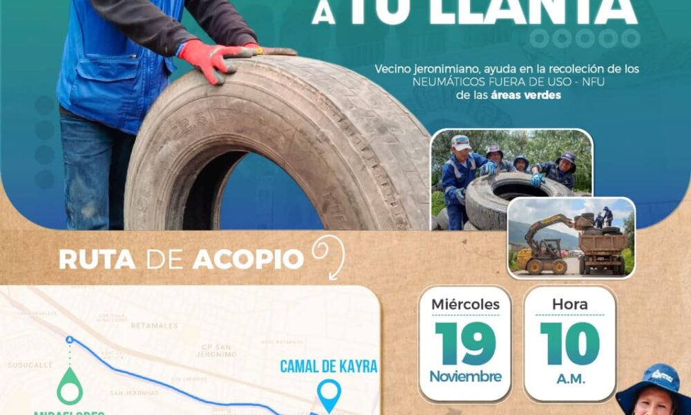 #cusco#aprimerahora.com.- Con el objetivo de acopiar neumáticos fuera de uso y frenar su acumulación en áreas públicas, la Municipalidad Distrital de San Jerónimo, con el alcalde Maximo Rimachi Morales, a través del Área de Valorización de Residuos Sólidos, llevará a cabo este miercoles 19 la campaña “Ponle pare a tu llanta” en distintos puntos del distrito, interviniendo zonas previamente identificadas durante operativos de limpieza, donde se evidenció que la presencia de llantas abandonadas seguía generando desorden y afectando el entorno urbano.