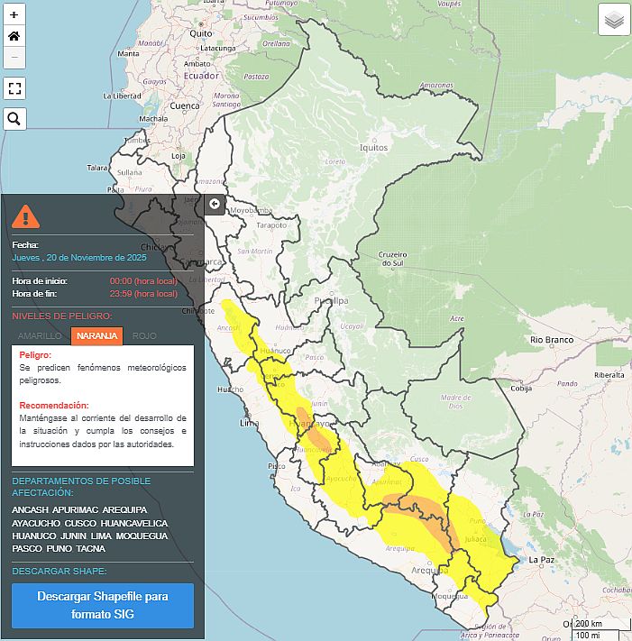 En plena primavera, el Servicio Nacional de Meteorología e Hidrología del Perú (Senamhi) ha activado una alerta naranja en Lima y otras regiones del país, por descenso de temperatura nocturna “de moderada a fuerte intensidad”.El organismo advirtió que el intenso frío -que en algunas zonas alcanzará los 14 grados bajo cero- estará acompañado de ráfagas de viento con velocidades próximas a los 50 km/h.La alerta naranja estará activa hasta el jueves, 20 de noviembre, y abarca los departamentos Áncash, Apurímac, Arequipa, Ayacucho, Cusco, Huancavelica, Huánuco, Junín, Lima, Moquegua, Pasco, Puno y Tacna.Pronósticos durante la alerta naranjaEn el marco de esta alerta naranja, el Senamhi pronosticó para este miércoles, 19 de noviembre, temperaturas mínimas cercanas a los -3 °C en zonas sobre los 3 200 m.s.n.m. en la sierra centro y valores próximos a los -14 °C en áreas situadas por encima de los 4 000 m.s.n.m. en la sierra sur.En tanto, para el jueves, 20 de noviembre, se prevén temperaturas mínimas cercanas a los -3 °C en zonas sobre los 3 200 m.s.n.m. en la sierra centro y valores próximos a los -13 °C en áreas situadas por encima de los 4 000 m.s.n.m. en la sierra sur.