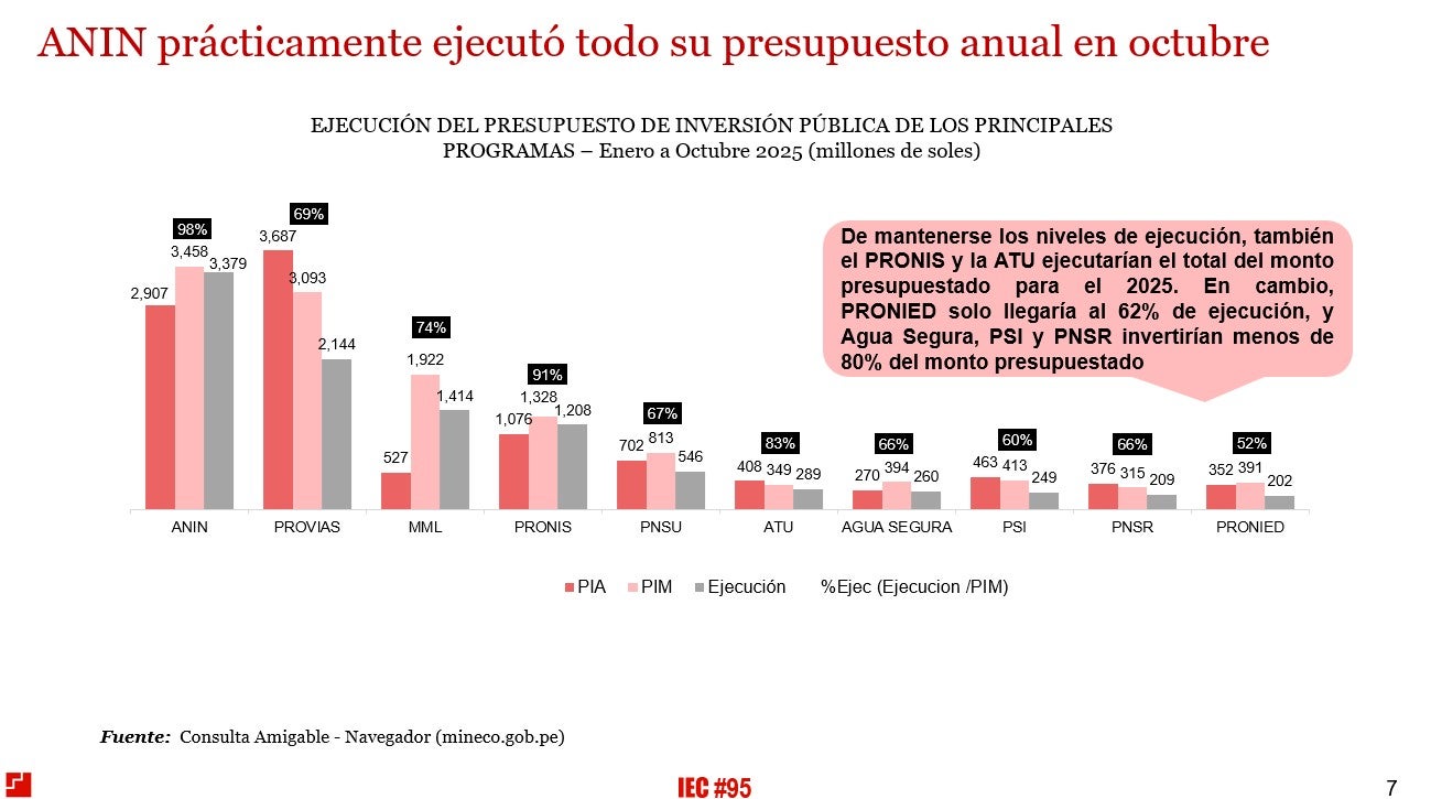 El panorama de la inversión pública en infraestructura se ha polarizado tras revelarse que entidades clave como la Autoridad Nacional de Infraestructura (ANIN), la Autoridad de Transporte Urbano (ATU) y el Programa Nacional de Inversiones en Salud (PRONIS) están a punto de agotar su presupuesto para el 2025, un problema atribuido a una «mala asignación de los recursos».Mientras que el gobierno nacional decrece en su nivel de ejecución, esta falta de previsión ha generado una crisis en proyectos esenciales, especialmente aquellos de prevención.Según informó Guido Valdivia, vicepresidente ejecutivo de la Cámara Peruana de la Construcción (CAPECO), la ANIN prácticamente ejecutó la totalidad de su presupuesto en octubre, una situación que también se alcanzaría antes de fin de año en la ATU y el PRONIS.
