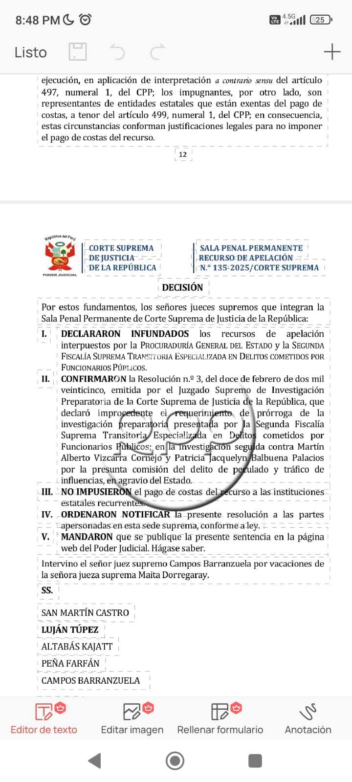 La sala suprema también declaró infundado el recurso de apelación que presentó ,por su parte, la Procuraduría General del Estado, el último 19 de febrero, con el que buscaba que se ampliara por ocho meses está investigación preparatoria.