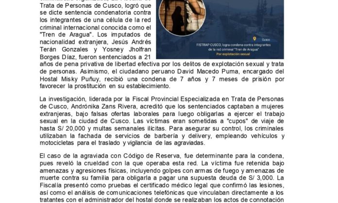 La entrada Condenan a 21 años de prisión a integrantes del «Tren de Aragua» por explotación sexual se publicó primero en A Primera Hora Cusco.