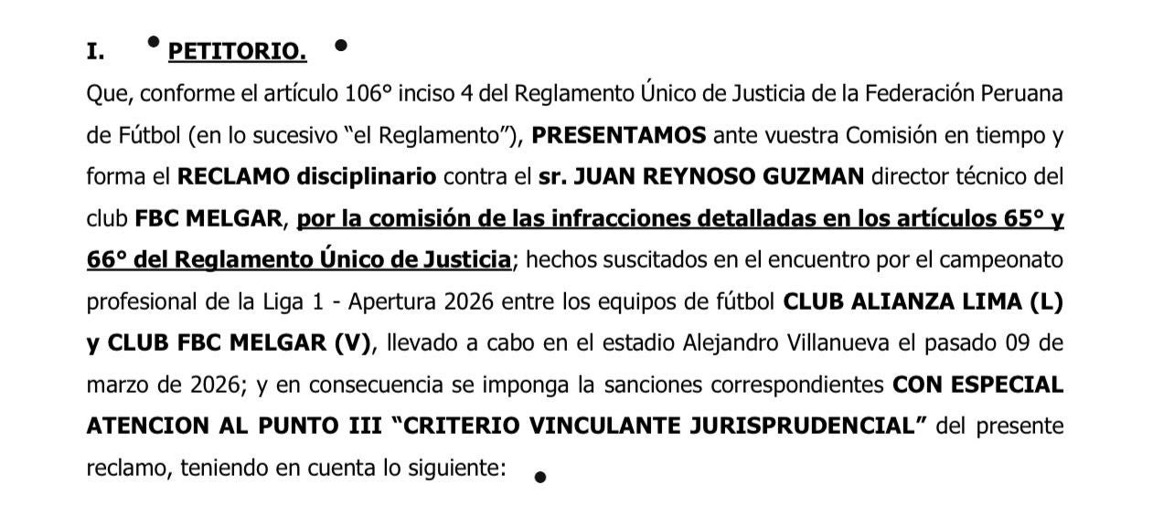 Alianza Lima presentó un reclamo ante la Comisión Disciplinaria de la Federación Peruana de Fútbol (FPF) contra Juan Reynoso, debido que considera que el entrenador de Melgar realizó gestos provocativos contra los hinchas íntimos en el estadio Alejandro Villanueva.Hay que indicar, que dentro del documento se solicita una sanción mínima de cuatro fechas contra Reynoso, que respondió con gestos a los abucheos por parte de la barra blanquiazul.»Que, conforme el artículo 106° inciso 4 del Reglamento Único de Justicia de la Federación Peruana de Fútbol (en lo sucesivo “el Reglamento”), presentamos ante vuestra Comisión en tiempo y forma el reclamo disciplinario contra el sr. Juan Reynoso Guzmán director técnico del club FBC MELGAR, por la comisión de las infracciones detalladas en los artículos 65° y 66° del Reglamento Único de Justicia», dice parte del documento.»Hechos suscitados en el encuentro por el campeonato profesional de la Liga 1 – Apertura 2026 entre los equipos de fútbol Club Alianza lima (L) y Club Melgar (V), llevado a cabo en el estadio Alejandro Villanueva el pasado 09 de marzo de 2026; y en consecuencia se imponga las sanciones correspondientes con especial atención al punto III ‘Criterio vinculante jurisprudencial del presente reclamo», agregó.Juan Reynoso debutó en el fútbol profesional con Alianza, pero en 1993 fichó por Universitario de Deportes. Este contrato rompió el mercado peruano y lo convirtió de héroe a villano para el hincha íntimo.