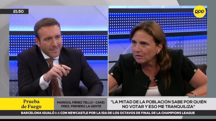 Marisol Pérez Tello, candidata presidencial del partido Primero La Gente, aseguró que durante los próximos debates que se realicen entre los postulantes a las elecciones tendrá la oportunidad de señalar a los miembros del «pacto mafioso» que han causado daño al país en los últimos años.Pérez Tello, en una entrevista al programa Prueba de Fuego de RPP, señaló que en los debates estará frente a Keiko Fujimori, Rafael López Aliaga y José Luna Gálvez.»Yo creo que estos 33 días que quedan (para las elecciones), con dos días de debate que serán muy importantes, porque voy a poder decirle a tres miembros de ese pacto mafioso que es por su culpa que estamos así», expresó.La candidata presidencial señaló lo que cuestionaría a los otros candidatos cuando los vea frente a frente. En ese sentido, expresó que es posible criticarlos sin llegar al insulto.»Me vas a hacer hablar de crimen organizado con Podemos, que es responsable de la situación que vivimos. Me vas a hacer hablar de empleo con alguien que en su vida ha trabajado y no tiene la menor idea de lo que eso significa y lo que ha hecho es destruir el país sistemáticamente con un poder que cuando ha tenido en el Congreso no ha ejercido con responsabilidad», enfatizó Pérez Tello.La postulante por Primero la Gente destacó que las encuestas muestran que la mitad de la población sabe por qué partidos no va a votar por el daño que le han causado al Perú. Caso Miguel del CastilloMarisol Pérez Tello aseguró que Miguel del Castillo está separado de todo cargo partidario en Primero La Gente y es posible que sea expulsado de la agrupación. Esto tras la denuncia de que presuntamente esta persona habría desviado un monto de dinero, producto de la franja electoral, para su canal Nativa.»Somos el único caso que hemos renunciado a la franja electoral y que ha denunciado que no hubo voluntad partidaria de asignársela a él», explicó.Pérez Tello dijo que el propio partido hizo la denuncia pública y que el caso ya se investiga en la Fiscalía. «Nosotros probamos ante ONPE que no le dimos la autorización para que se hiciera eso y esperamos que la plata no se transfiera», puntualizó.