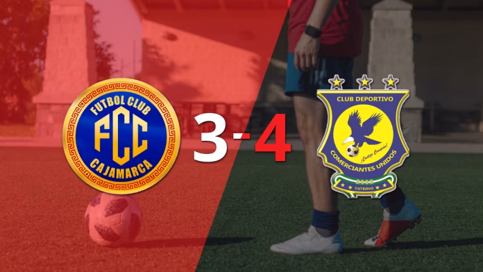 FC Cajamarca cayó por 4 a 3 como local ante Com. Unidos, en el duelo disputado por la fecha 7 del campeonato peruano. Los goles del partido para el local los anotaron Brandon Palacios (19′ 1T), Arley Rodríguez (32′ 1T) y Hernán Barcos (39′ 2T). Mientras que los goles de visitante los hicieron Maximiliano Perez (8′ 2T, de penal), Wilter Ayoví (25′ 2T), José Antonio Parodi (29′ 2T) y Juan José Rodríguez (33′ 2T). Una gran jugada de FC Cajamarca, a los 32 minutos del primer tiempo, fue la que movió el marcador gracias a Arley Rodríguez. Ricardo Lagos envió un centro, que dominó el volante y pateó para superar a Matías Córdova Espinel.El mejor jugador del partido fue Rodrigo Vilca. El centrocampista de Comerciantes Unidos fue preciso con 3 pases efectivos.Hernán Barcos se destacó también en el estadio Héroes de San Ramón. El atacante de FC Cajamarca anotó 1 gol y disparó al arco contrario en 2 oportunidades.El técnico de FC Cajamarca, Carlos Silvestri, propuso una formación 4-5-1 con Carlos Mosquera en el arco; José Gallardo, Alexis Rodas, Matias Almirón y Ricardo Lagos en la línea defensiva; Pablo Míguez, Tomás Andrade, Arley Rodríguez, Mauricio Arrasco y Brandon Palacios en el medio; y Hernán Barcos en el ataque.Por su parte, el equipo de Antonio Mur salió a la cancha con un esquema 4-5-1 con Matías Córdova bajo los tres palos; Piero Guzmán, Flavio Alcedo, Juan José Rodríguez y Alexis Cossío en defensa; Agustín Rodríguez, Alexis Arias, Josuee Herrera, Rodrigo Vilca y Jean Carlo Olivares en la mitad de cancha; y Maximiliano Perez en la delantera.Sebastián Lozano Bedoya fue el árbitro que dirigió el partido en el estadio Héroes de San Ramón.El próximo partido de FC Cajamarca en el campeonato será como visitante ante Cienciano, mientras que Com. Unidos recibirá a Universitario. Cambios en FC Cajamarca36′ 1T – Salió José Gallardo por Carlos Gómez54′ 2T – Salió Mauricio Arrasco por Jéfferson Orejuela73′ 2T – Salieron Arley Rodríguez por Jonathan Betancourt y Brandon Palacios por Carlos MezaAmonestados en FC Cajamarca: 10′ 1T José Gallardo (Conducta antideportiva) y 6′ 2T Arley Rodríguez (Conducta antideportiva)