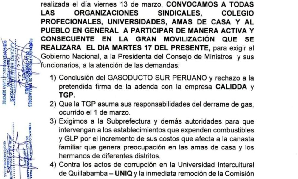 En esta ocasión indicaron que la movilización será con una plataforma de demandas, entre los que destacan es exigir a la Presidencia del Consejo de Ministros PCM la conclusión del Gasoducto Sur Peruano y rechazo a la pretendida firma de la adenda con la empresa Calidda y TGP al mismo tiempo que esta asuma sus responsabilidades del derrame de gas ocurrido el pasado 01| de marzo.