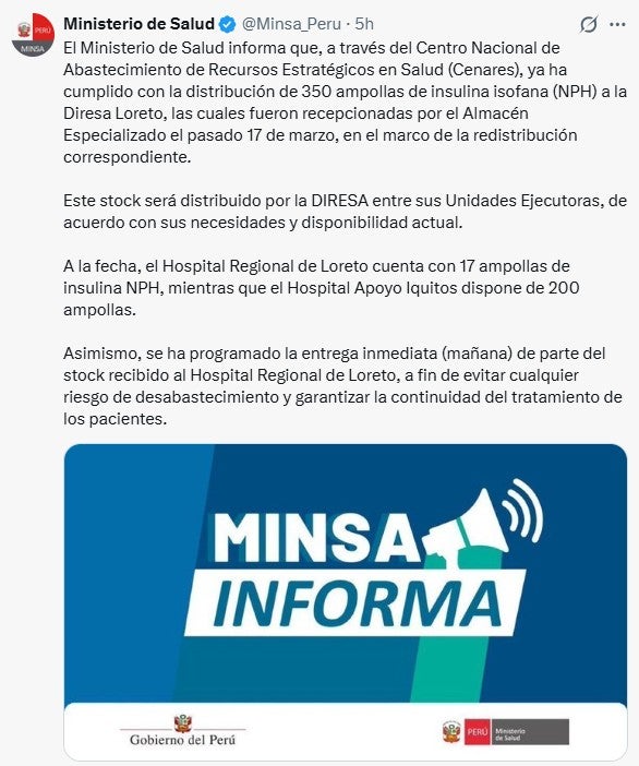 El Ministerio de Salud (Minsa) se pronunció sobre la situación del abastecimiento de insulina en la ciudad de Iquitos, en la región de Loreto, luego de que un vecino de la zona denunciara en RPP la escasez de este medicamento esencial para los pacientes con diabetes.En diálogo con La rotativa del aire, el ciudadano Gilberto Llerena señaló que la falta de insulina viene afectado directamente a su familia y a muchos otros en la región.Él relató que su esposa lleva más de una semana sin poder acceder al medicamento y que hace 10 días se presentó en el Hospital III Iquitos para recoger la insulina, pero le dijeron que regrese dentro de 10 a 15 días.“Hoy fuimos, se cumplieron los 10 días y no hay. Nos dijeron que vuelva de aquí a 15 días. Ella lleva 10 días sin insulina, más 15 días, estamos hablando de cerca de un mes. Esto, definitivamente, afecta a los asegurados en Loreto e Iquitos”, manifestó.  Minsa informó que distribuyó insulinaHoras después de esta denuncia, el Ministerio de Salud comunicó que, a través del Centro Nacional de Abastecimiento de Recursos Estratégicos en Salud (Cenares), se completó la distribución de 350 ampollas de insulina isofana (NPH) a la Dirección Regional de Salud (Diresa) Loreto.El lote -según indicó en un comunicado- fue recepcionado el pasado 17 de marzo por el Almacén Especializado, en el marco de un proceso de redistribución.“Este stock será distribuido por la Diresa entre sus Unidades Ejecutoras, de acuerdo con sus necesidades y disponibilidad actual”, informó.Asimismo, sostuvo que a la fecha “el Hospital Regional de Loreto cuenta con 17 ampollas de insulina NPH, mientras que el Hospital Apoyo Iquitos dispone de 200 unidades”.Finalmente, señaló que se ha programado la entrega inmediata -prevista para mañana- de parte del stock recibido al Hospital Regional de Loreto, a fin de “evitar cualquier riesgo de desabastecimiento” y “garantizar la continuidad del tratamiento de los pacientes”.
