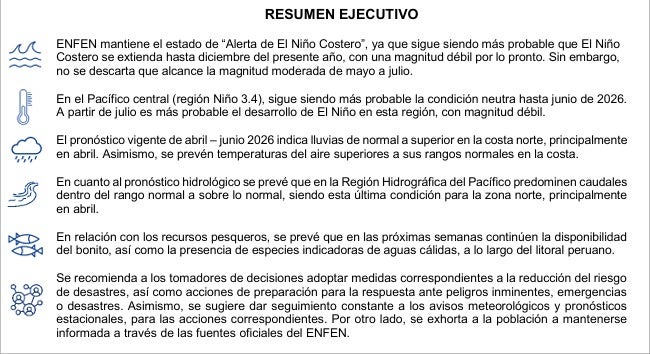 Factores oceanográficos y recursos hidrobiológicosLa persistencia del evento cálido está vinculada estrechamente al arribo de una onda Kelvin cálida a la costa sudamericana detectada en marzo, la cual ha alterado la estructura térmica de la columna de agua y elevado el nivel del mar.El ENFEN monitorea actualmente la propagación de nuevas ondas cálidas desde el Pacífico occidental que podrían arribar entre abril y junio, manteniendo las anomalías positivas de la temperatura superficial del mar frente al litoral peruano.En el ámbito biológico-pesquero, se prevé que la disponibilidad del bonito continúe en las próximas semanas a lo largo del litoral, acompañada por la presencia de especies indicadoras de aguas cálidas, como el cangrejo nadador (Euphylax dovii), especialmente en la zona norte del mar peruano.Estas condiciones reflejan un ecosistema marino en plena respuesta a la intrusión de masas de agua de origen ecuatorial y tropical.Recomendaciones para la gestión de riesgosAnte la inminencia de las precipitaciones y la prolongación del evento cálido, las autoridades han enfatizado la necesidad de que los gobiernos regionales y locales fortalezcan sus capacidades de respuesta y preparación.El seguimiento constante a los avisos meteorológicos y las actualizaciones del ENFEN resultan críticos para mitigar los posibles impactos socioeconómicos derivados de inundaciones o incrementos súbitos de caudales.»Se recomienda a los tomadores de decisiones adoptar medidas correspondientes a la reducción del riesgo de desastres, así como acciones de preparación para la respuesta ante peligros inminentes, emergencias o desastres», exhortó el organismo científico.