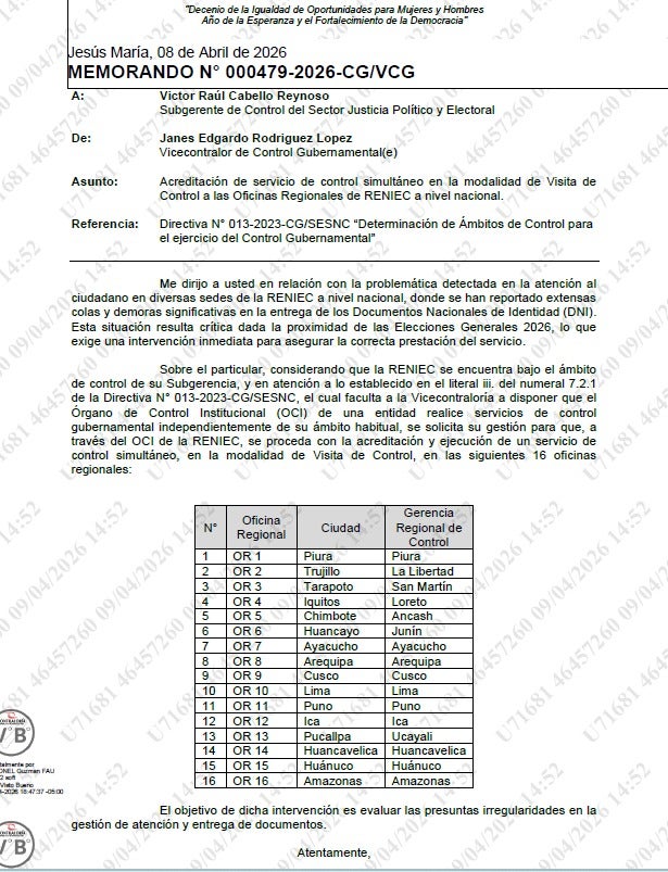La Contraloría General de la República dispuso la ejecución de un operativo de control simultáneo en 16 sedes regionales del Registro Nacional de Identificación y Estado Civil (Reniec) a nivel nacional.La medida fue oficializada mediante un memorando y, según el documento, response a las constantes denuncias por extensas colas y demoras críticas en la entrega del Documento Nacional de Identidad (DNI).“Esta situación resulta crítica dada la proximidad de las Elecciones Generales 2026, lo que exige una intervención inmediata para asegurar la correcta prestación del servicio”, señala el documento.Asimismo, el documento indica que el principal objetivo de la medida es evaluar las presuntas irregularidades en la atención y la demora injustificada en la entrega de documentos.“Sobre el particular, considerando que el Reniec se encuentra bajo el ámbito de control de su Subgerencia, y en atención a lo establecido en el literal ii) del numeral 7.2.1 de la Directiva N° 013-2023-CG/SESNC, el cual faculta a la Vicecontraloría a disponer que el Órgano de Control Institucional (OCI) de una entidad realice servicios de control gubernamental independientemente de su ámbito habitual, se solicita su gestión para que, a través del OCI del Reniec, se proceda con la acreditación y ejecución de un servicio de control simultáneo, en la modalidad de Visita de Control”, agrega el memorando.Además, el comento señala que el control se aplicará en 16 oficinas regionales del Reniec, entre ellas: Piura, Trujillo, Tarapoto, Iquitos, Chimbote, Huancayo, Ayacucho, Arequipa, Cusco, Lima, Puno, Ica, Pucallpa, Huancavelica, Huánuco y Amazonas.