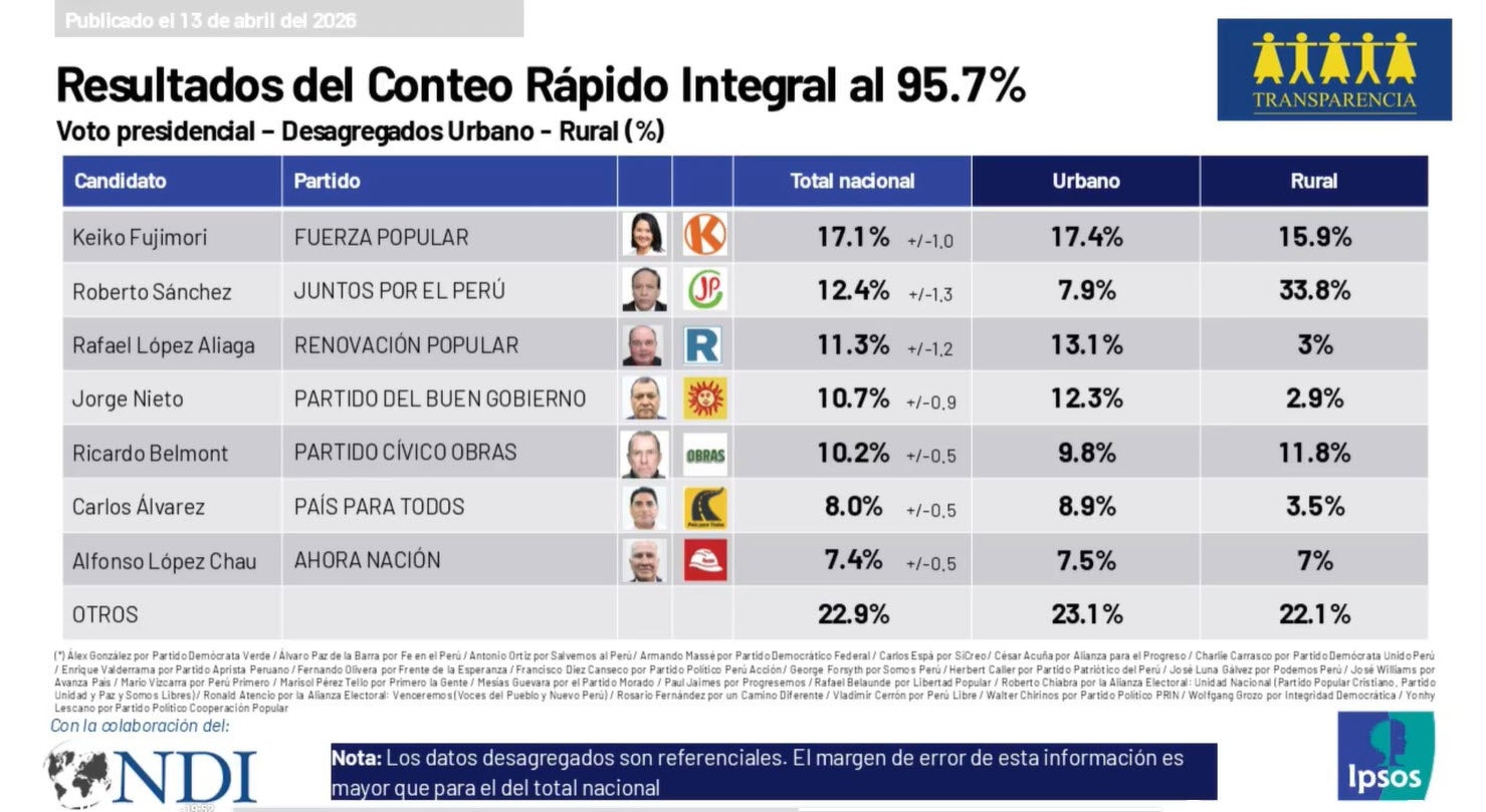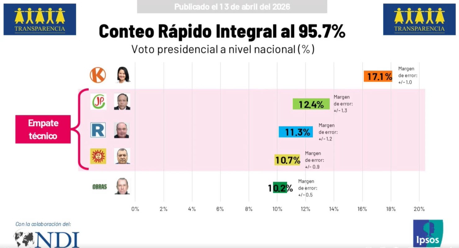 La Asociación Civil Trasparencia y la empresa consultora IPSOS Perú presentaron este lunes su conteo rápido integral al 95.7%, de los resultados de las elecciones generales 2026.Según dichos datos, Keiko Fujimori, candidata presidencial de Fuerza Popular, encabeza los votos con 17.1%, seguida por un triple empate técnico en el segundo lugar en el cual aparecen Roberto Sánchez, candidato presidencial de Juntos por el Perú, con 12.4%; Rafael López Aliaga, de Renovación Popular, con 11. 3%; y Jorge Nieto, de Buen Gobierno, con 10.7%.“Existe un empate estadístico técnico entre 3 candidaturas: candidato Roberto Sánchez de Juntos por el Perú con un margen de error de +/-1.3%. Candidato Rafael López Aliaga de Renovación Popular, 11.3%, con un margen de error de +/-1.2%. Candidato Jorge Nieto del partido del Bueno Gobierno, 10.7%, con un margen de error de +/-0.9%. Otros candidatos, 22.9%», indicó Alvaro Henzler, presidente de Transparencia.»A partir de estos resultados se observa que la candidata Keiko Fujimori mantiene una ventaja clara sobre el resto de las candidaturas, incluso al considerar el margen de error de ambas candidaturas. Esto permite afirmar, con alto nivel de confianza estadístico, que la candidata Fujimori se ubicaría en el primer lugar y avanzaría a la segunda vuelta», destacó.Henzler remarcó que, para el segundo lugar, «se identifica una superposición entre los rangos estimados de los candidatos Roberto Sánchez, Rafael López Aliaga y Jorge Nieto», por lo que aún no es posible determinar cuál pasaría a la segunda vuelta con la candidata del fujimorismo. «Esta superposición indica la existencia de un empate técnico, por lo que, con la información disponible hasta este momento, no es posible determinar cuál es la candidatura de estas que ocuparía el segundo lugar y pasaría a una segunda vuelta en junio. En ese contexto, sería necesario esperar con calma, con paciencia, los resultados oficiales para definir cuál de estos candidatos acompañará a la candidata Fujimori en la segunda vuelta», añadió.