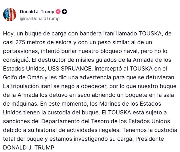 “Hoy, un buque de carga de bandera iraní llamado Touska, de casi 275 metros de eslora y con un peso similar al de un portaaviones, intentó burlar nuestro bloqueo naval, y no les salió nada bien”, informó Trump en un mensaje publicado en su red social Truth Social.