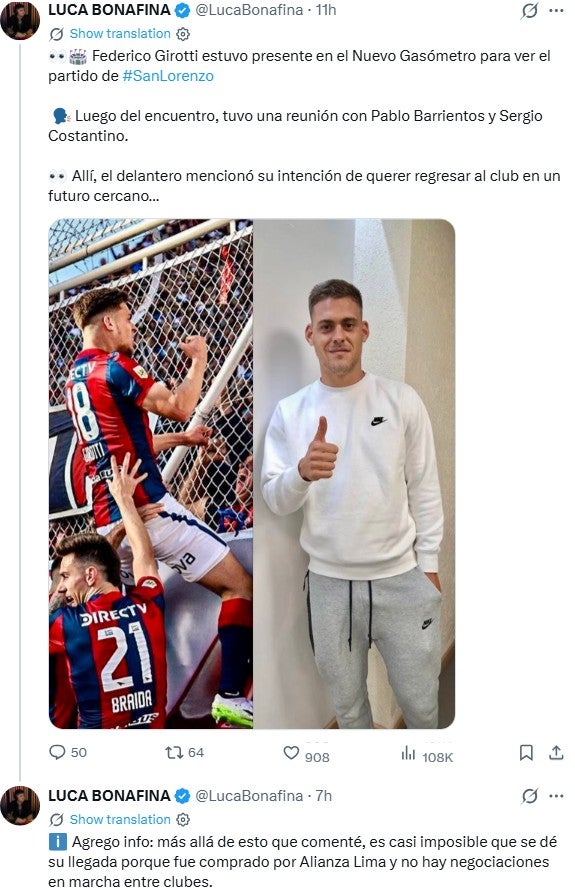Alianza Lima goleó 8-0 a Cusco FC y celebra su buen momento con el liderato del Torneo Apertura. Sin embargo, no todo es felicidad en el cuadro victoriano debido que Federico Girotti sufrió una lesión en el hombro izquierdo.Girotti ya se encuentra en rehabilitación y se estima que estará fuera de las canchas al menos un mes. En esta coyuntura, decidió viajar a Argentina para reencontrarse con su familia.Según reportó el periodista Luca Bonafina de Diario Olé de Argentina, Girotti llegó al Nuevo Gasómetro para ver el partido de San Lorenzo contra Vélez Sarsfield. Luego se reunió con el presidente del ‘Ciclón’. «Allí, el delantero mencionó su intención de querer regresar al club en un futuro cercano», apuntó tal como se aprecia en una publicación en la red social X.Eso sí, Bonafina resalta que es «casi imposible» que el atacante de 26 años retorne al fútbol argentino, ya que «fue comprado por Alianza y no hay negociaciones entre ambos clubes».Girotti espera recuperarse lo más antes posible de su lesión para buscar más oportunidades en Alianza, club donde tiene contrato hasta el 2028.