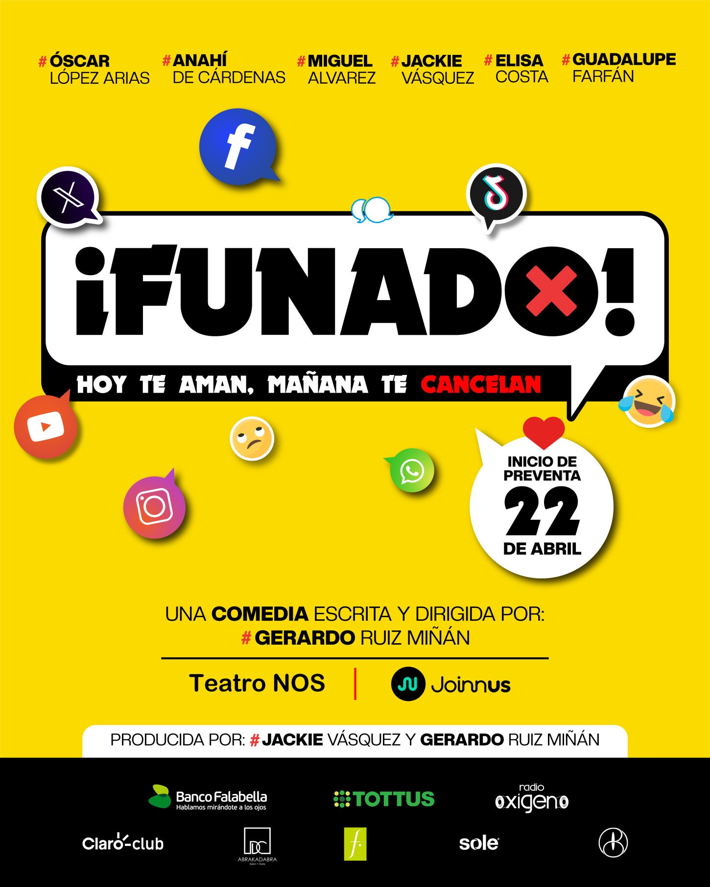 El Teatro NOS PUCP recibe al elenco de la temporada de ¡Funado!, comedia teatral escrita y dirigida por Gerardo Ruiz Miñán. El estreno se realizará el día jueves 10 de septiembre a las 8:30 p.m. en su local de San Isidro. Un publicista y escritor ve cómo su vida da un giro inesperado tras una serie de declaraciones que desatan una ola de reacciones en redes sociales. Lo que comienza como un episodio que se sale de control rápidamente se convierte en un fenómeno público imposible de detener. Mientras intenta entender lo ocurrido, todo a su alrededor empieza a tambalear: su imagen, sus vínculos y la manera en que es percibido por los demás. ¡Funado! pone en escena las dinámicas del juicio público y la exposición en la era digital, y lo fácil que es pasar -de un momento a otro- de decir algo a que todos hablen de ti. ¿De qué trata ‘¡Funado!’?¡Funado! es una comedia que aborda, desde el humor y la sátira, los mecanismos contemporáneos de validación social, juicio público y cancelación en la era digital. La historia sigue a un personaje que, tras emitir una serie de declaraciones polémicas en un contexto público, se convierte en el centro de atención en redes sociales donde su imagen es amplificada y sometida al escrutinio colectivo. A medida que la situación va escalando, la obra pone en evidencia la rapidez con la que se construyen narrativas, la fragilidad de la reputación en entornos digitales y la tensión entre la experiencia individual y la percepción masiva.“Para mí, hacer ¡Funado! es mirar de frente cómo nos estamos relacionando hoy. Las redes sociales son una herramienta poderosa, pero todavía las usamos como quien descubre algo filudo sin saber bien cómo manejarlo. Pueden acercarnos, pero también herirnos con facilidad. La obra nace de esa curiosidad: entender ese comportamiento y observarnos en él. Pero también, y, sobre todo reírnos. Porque en medio de tanta opinión y exposición, hemos olvidado tomarnos con un poco más de ligereza. Y quizá ahí, en esa risa, podamos reconocernos”, nos dice el dramaturgo y director de la obra Gerardo Ruiz Miñán.¿Quiénes forman parte del elenco de ‘¡Funado!’?Entre los actores se encuentra Óscar López Arias, Anahí De Cárdenas, Miguel Alvarez, Jackie Vásquez, Elisa Costa y Guadalupe Farfán