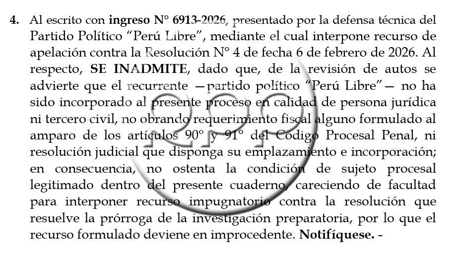 El juez Leodán Cristóbal Ayala no admitió el recurso de apelación que presentó la defensa técnica del partido político Perú Libre contra la resolución que emitió dicho magistrado, el último 6 de febrero, en la que dispuso la referida ampliación al declarar “fundado en parte” un requerimiento que hizo la Primera Fiscalía Supraprovincial Corporativa Especializada en Delitos de Lavado de Activos – Tercer Despacho, el 27 de octubre del 2025, para que se ordenará una prórroga de esta investigación preparatoria seguida a Cerrón Rojas y otros por los presuntos delitos de organización criminal y lavado de activos, pero por un plazo de 36 meses.