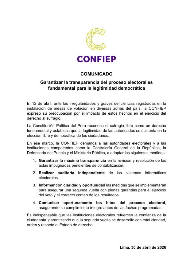 La Confederación Nacional de Instituciones Empresariales Privadas (Confiep) demandó la realización de una “auditoría independiente de los sistemas informáticos electorales”, ante las irregularidades y graves deficiencias registradas en la distribución del material electoral y la instalación de mesas de votación durante los comicios del pasado 12 de abril.A través de un comunicado, la Confiep solicitó a las autoridades electorales y las instituciones competentes, entre ellas la Contraloría General de la República, la Defensoría del Pueblo y el Ministerio Público, que se garantice la máxima transparencia en la revisión y resolución de las actas impugnadas y que están pendientes de contabilización.El gremio empresarial también exhortó a las instituciones electorales a informar con claridad las medidas que se implementarán para “asegurar una segunda vuelta con plenas garantías para el ejercicio del voto y el correcto conteo de los resultados”.Asimismo, exhortó a las autoridades a comunicar oportunamente los hitos del proceso electoral, asegurando su cumplimiento íntegro antes de las fechas programadas.“Es indispensable que las instituciones electorales refuercen la confianza de la ciudadanía, garantizando que la segunda vuelta se desarrolle con total claridad, orden y respeto al Estado de derecho”, concluyó el comunicado.